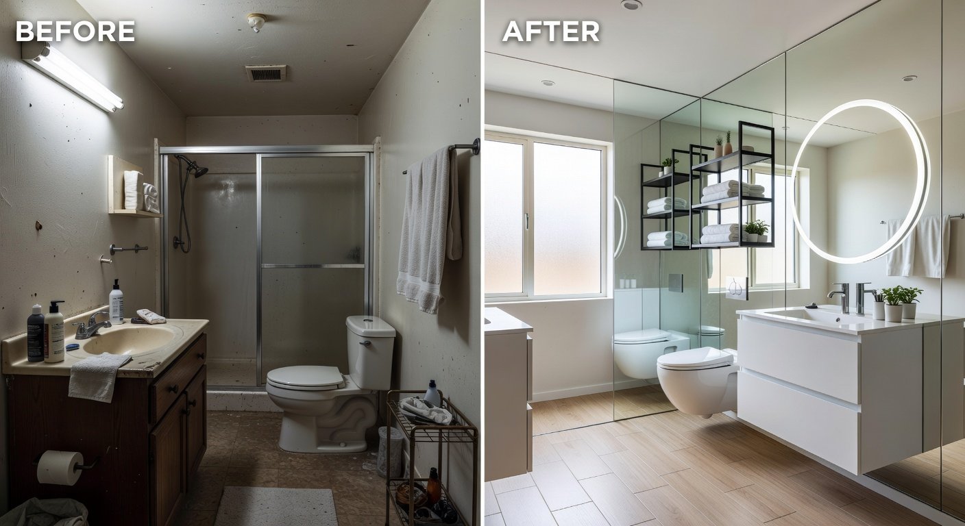 Before: Cramped sink area eating into shower space. After: Wall-hung sink with under-storage, gaining 2 sq ft. These visuals highlight how small tweaks yield massive impact—perfect for Pinterest boards or contractor pitches.