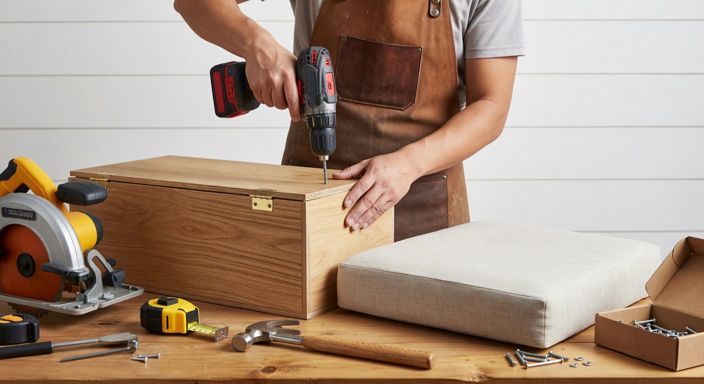 - Attach hinges to seat top; add foam cushion covered in durable outdoor fabric.